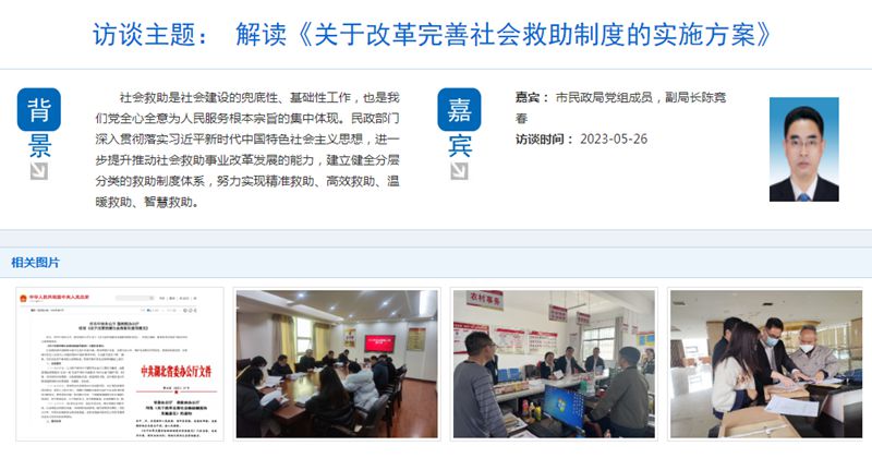 陈竞春:社会救助事关困难群众基本生活和衣食冷暖,关系民生、连着民心,是社会建设的兜底性、基础性工作。党的十八大以来,党中央、国务院对社会救助工作作出一系列重大部署,2014年国务院颁布《社会救助暂行办法》,确立了以最低生活保障、特困人员供养、受灾人员救助、医疗救助、教育救助、住房救助、就业救助、临时救助为主体,社会力量参与为补充的“8+1”社会救助制度框架。2020年,中办、国办印发《关于改革完善社会救助制度的意见》,2021年,省委办公厅、省政府办公厅印发《关于改革完善社会救助制度的实施意见》,对各项社会救助作出了一系列新规定、新要求,为推动新时代社会救助改革和发展提供了纲领性指引。